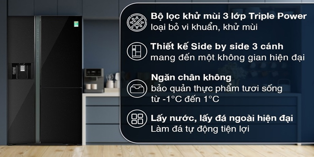 - Tủ lạnh Hitachi: nổi bật với công nghệ Triple Power giúp loại bỏ vi khuẩn, khử mùi mạnh mẽ, hạn chế mùi thực phẩm nặng như cá, thịt sống…