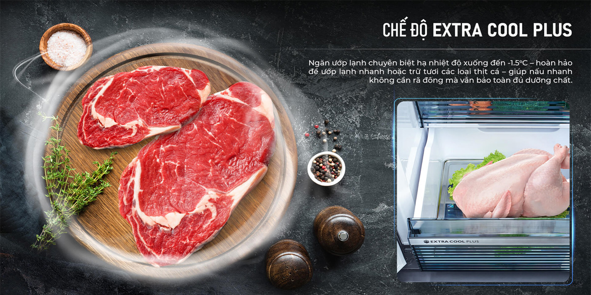 - Tủ lạnh Sharp: Các dòng tủ có Extra Cool Plus, giữ nhiệt độ ổn định khoảng 0–2°C, giúp bảo quản đồ ăn chế biến sẵn, rau củ nhanh chóng mà không làm đóng đá.