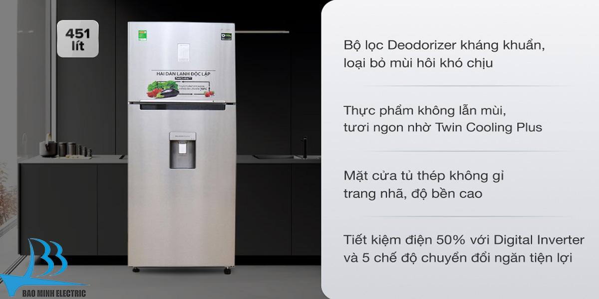 - Tích hợp các công nghệ cao như: Twin Cooling Plus (làm lạnh độc lập 2 dàn), SpaceMax (tối ưu không gian lưu trữ), Digital Inverter, kết nối Smart things, bảng điều khiển cảm ứng bên ngoài.