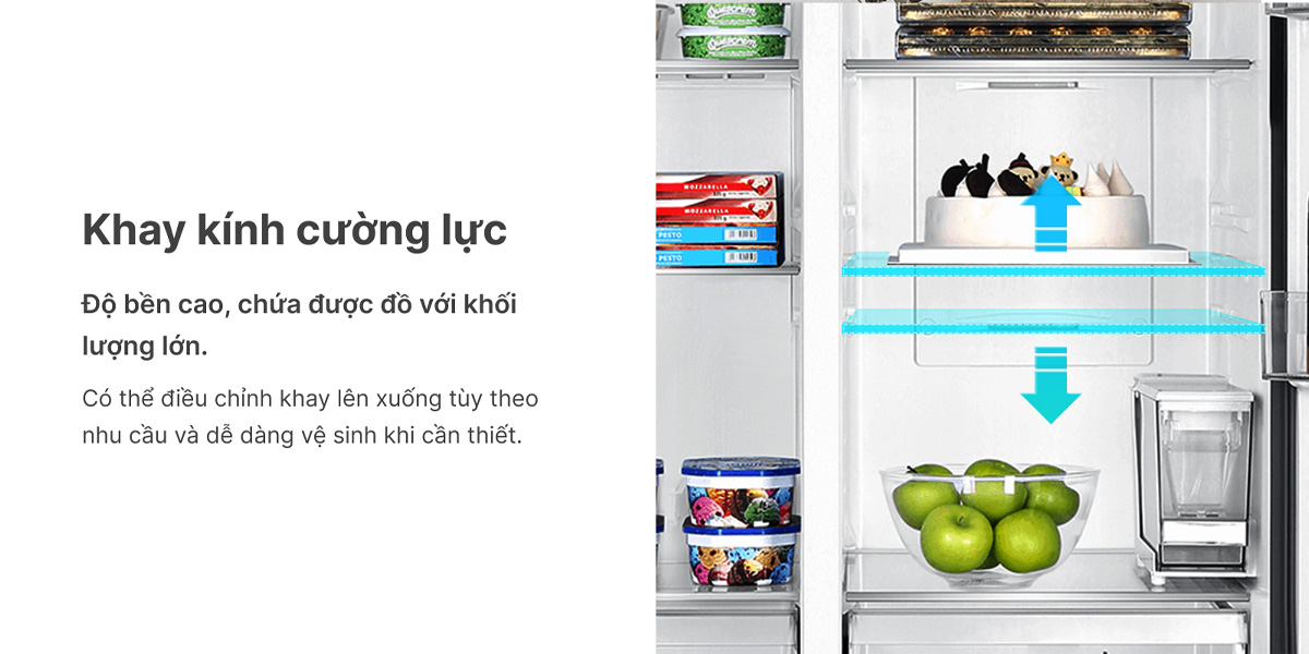 - Khay kính chịu lực: Độ bền cao, có thể chứa được đồ có khối lượng lớn. Bạn có thể điều chỉnh lên hay xuống tùy theo nhu cầu sử dụng và có thể dễ dàng vệ sinh khi cần thiết.