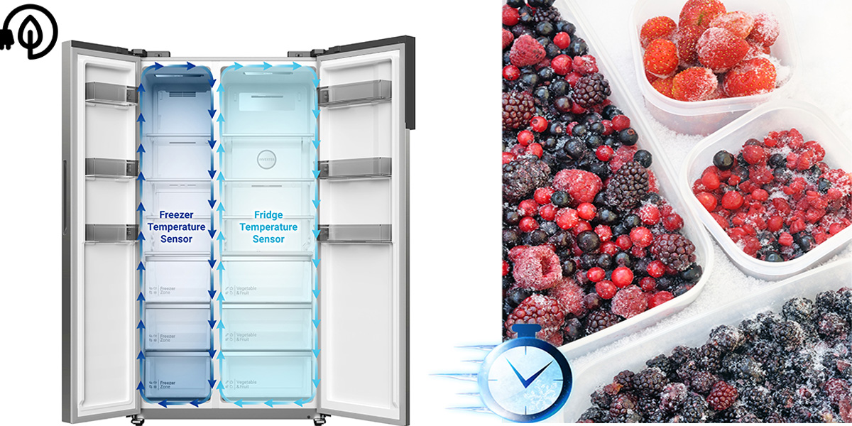 - Tủ được trang bị công nghệ làm lạnh vòng cung giúp khí lạnh được lan tỏa đồng đều khắp không gian tủ, tránh thổi trực tiếp vào thực phẩm hạn chế tối đa tình trạng đông đá hay thiếu lạnh ở một số khu vực, đảm bảo khí lạnh được thổi đồng đều, giúp bảo quản thực phẩm được lâu hơn, tươi mới hơn.